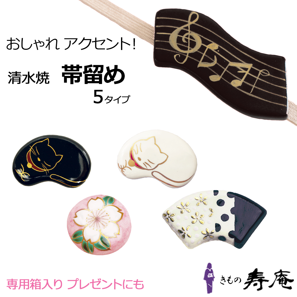 ネコポス 送料無料 帯留 さくら 桜 白猫 黒猫 白 黒 五線譜 扇面 三分紐用 清水焼 陶器 伝統工芸 母の日 ギフト 贈り物 プレゼント ポイント消化 新品 日本製