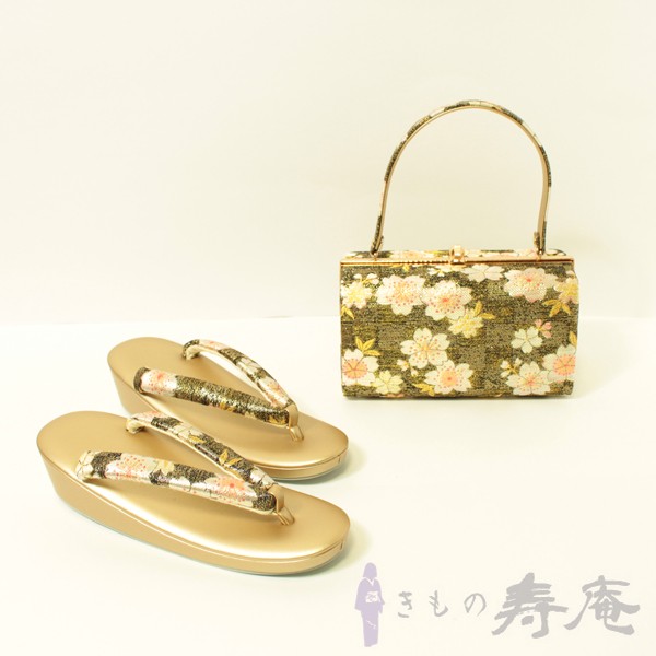 草履の台は金色で、花緒はバックと同じ織物が使われています。