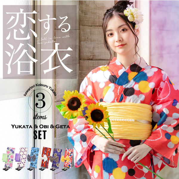 【商品内容】浴衣、帯、色柄おまかせ下駄の計3点セット