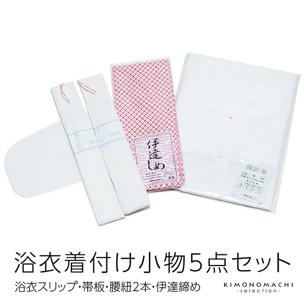 紐でしめるタイプのスリップに、腰紐2本・伊達締め1本・帯板1枚が入っています。スリップは日本製です。