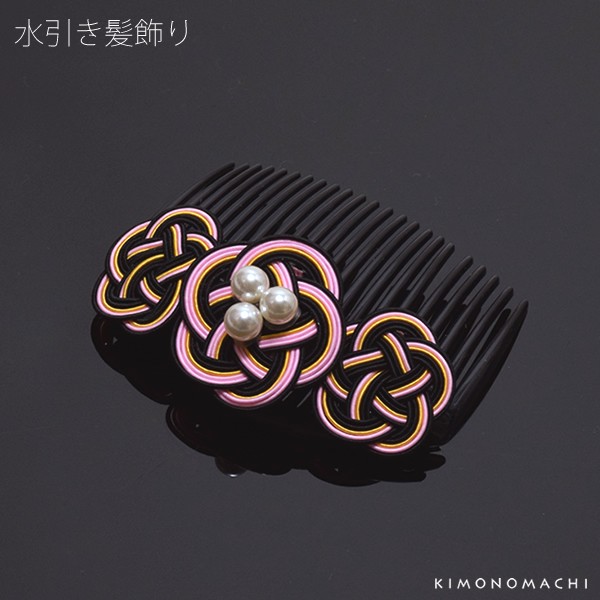 【カラー】ピンク、黄色、黒色の色使いの水引きのお花。コームは黒色。