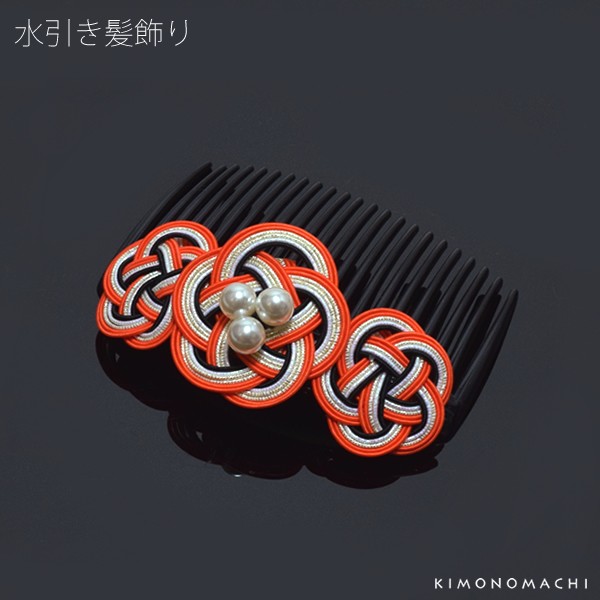 水引き飾りコーム髪飾りです。お着物にはもちろん、普段使いにもお洒落で、合わせやすい髪飾りです。振袖などの華やかなお着物にもポイントとしてつけても素敵です。