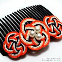 【カラー】濃いオレンジ、ゴールド、ラメ感のある白色、黒色の色使いの水引きのお花。コームは黒色。
