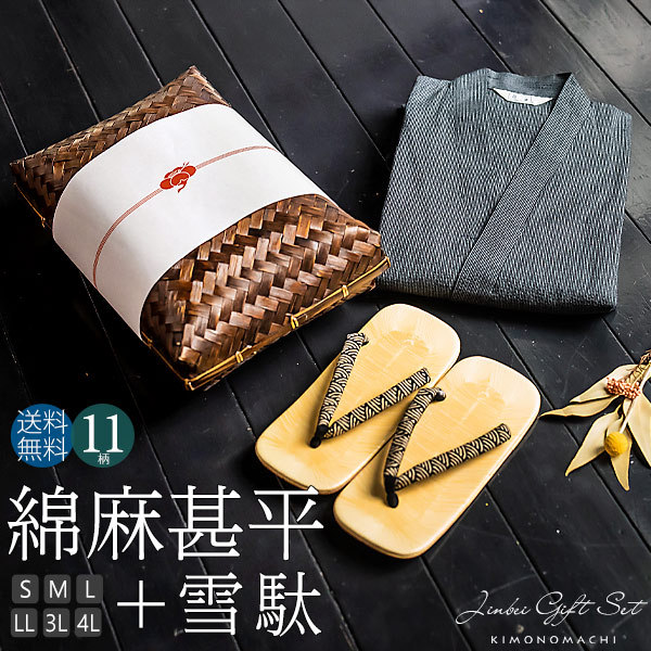 【商品内容】甚平1点(上着とズボンのセット)と雪駄(鼻緒柄おまかせ)のセット、竹籠入り・梅熨斗ラッピング付き
