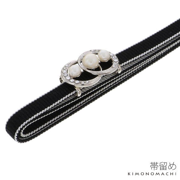 シルバーの台にパールビーズ、ラインストーンがお洒落な帯留めです。シンプルで、上品で、大人のお洒落な雰囲気で合わせていただけます。
