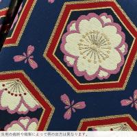 【色柄】深い紺色の地に金色、赤の亀甲。亀甲の中に三ツ割の落ち着いたピンクとベージュの桜の花。