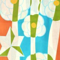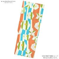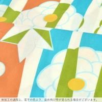 オフホワイトに、ターコイズ系の水色、落ち着いた橙色の大きなよろけ縞。淡い水色のラインで表現された麻の葉と花紋。ポイントに深い黄緑色の配色。