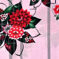 淡いピンク色の地に、黒のステッチ状の破線の縞。黒いシルエットの花。赤や白、濃ピンク、緑の花々。