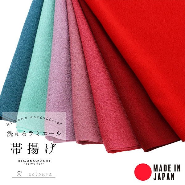テイジンが開発したラミエール素材の洗える帯揚げです。洗濯しても縮まず、光沢のある風合いが変わらないのがうれしいですね。色落ちの心配もなく、気軽にお使いいただける帯揚げとして重宝していただけると思います。淡い上品なお色からビビットで個性的なお色まで豊富に取り揃えております。様々なカラーの中からお気に入りのお色をぜひ見つけてくださいね。