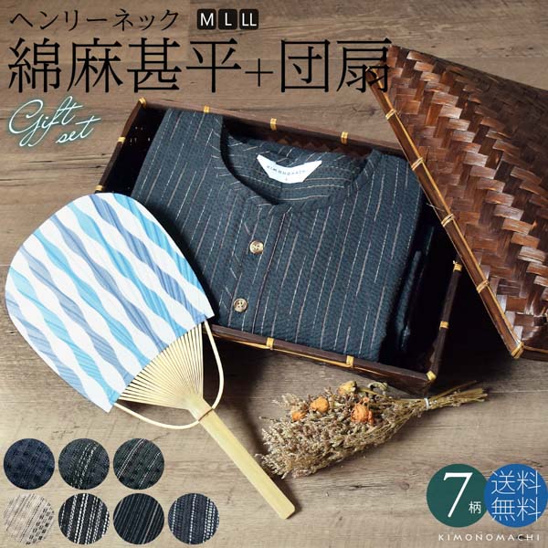 【商品内容】ヘンリーネック甚平1点(上着とズボンのセット)とうちわのセット、竹籠入り・梅熨斗ラッピング付き