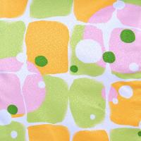 白地に、黄緑・黄色で角丸の四角を並べ、ピンクや白・緑の水玉を飛ばしたポップな文様のお着物です、カラフルな色の取り合わせ、元気な文様が心浮き立つデザインです。