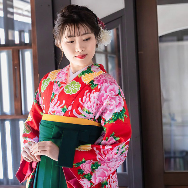 華やぎの赤地に、菊と牡丹の大輪の花を咲かせて、赤に大胆に配した菊と牡丹の文様に心奪われるお着物です、若さあふれる着姿を適えてくれます。