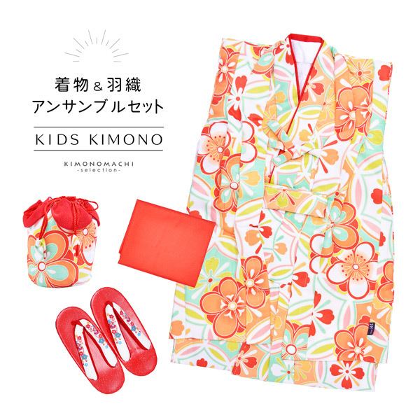 女の子の着物セットです。すぐに着られて動きやすく、ポリエステル素材なのでご家庭でお洗濯していただけます。