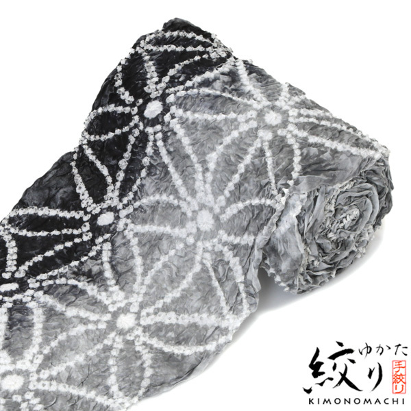 グレーと墨黒の縦ぼかしに白。白の絞りを連ねた星七宝つなぎの柄は格好良さの中に柔らかさを感じさせます。