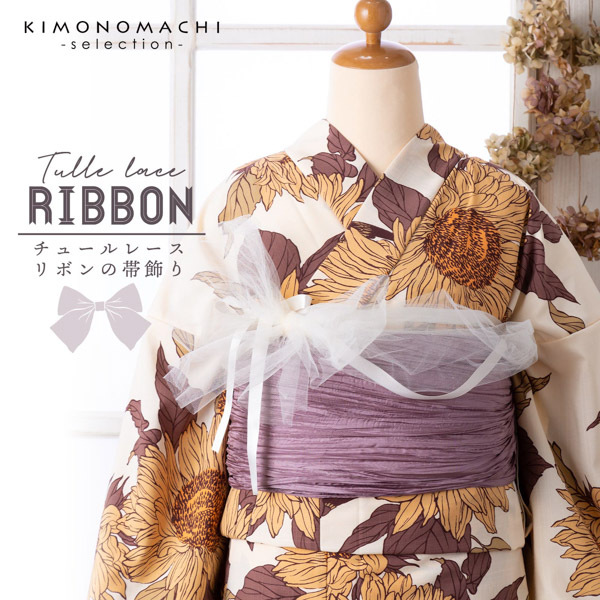 涼し気なふわふわチュールレースのリボン帯飾りです。浴衣や着物のコーデを手軽にランクアップできます。