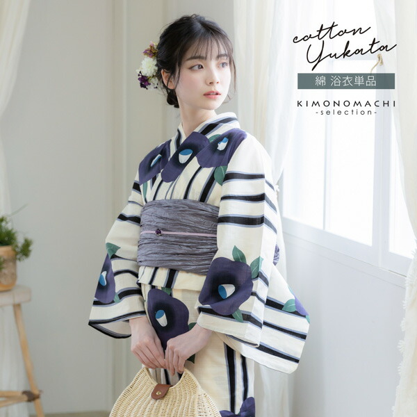 浴衣 レディース 女性浴衣単品 「スイートリリー:薄クリーム地×紫墨 よろけ縞に椿」Fサイズ 綿浴衣 プレタ浴衣 ブランド浴衣 大人浴衣 (メール便不可)