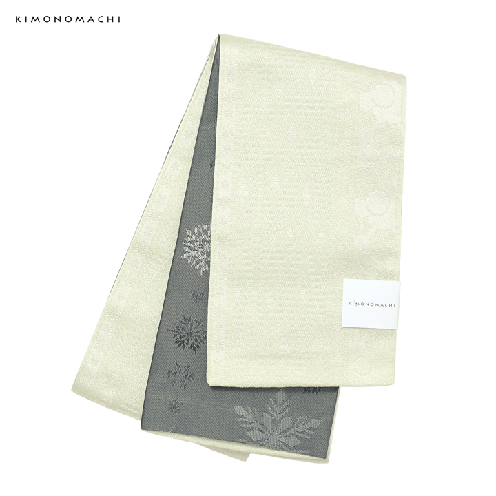 【色柄】オフホワイトとわずかに黄緑みのアイボリー。縦縞の中に菱格子文様、雪輪や雪花紋が配置された柄。裏はグレーの地に大小さまざまな雪の結晶紋。