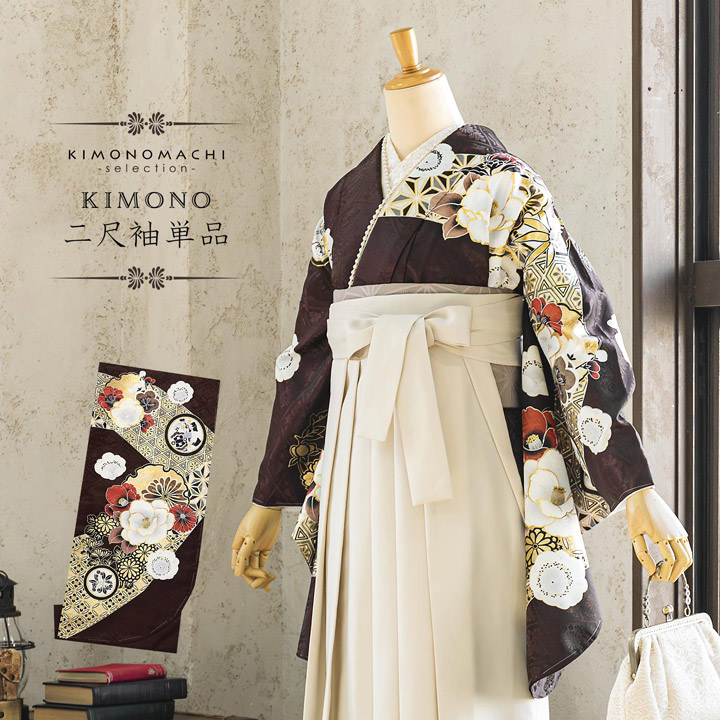 二尺袖着物 単品 絵羽「焦茶色 雪輪に四季花」Fサイズ お仕立て上がり 短丈 ショート丈 レディース 洗える着物 二尺袖 着物 袴に合わせて 卒業式 (メール便不可)