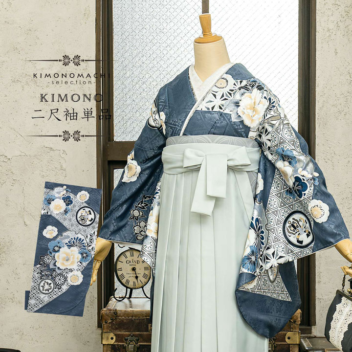 二尺袖着物 単品 絵羽「青鼠色 雪輪に四季花」Fサイズ お仕立て上がり 短丈 ショート丈 レディース 洗える着物 二尺袖 着物 袴に合わせて 卒業式 (メール便不可)