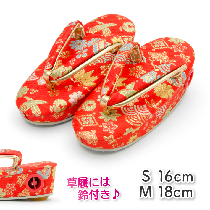 | 商品説明 | 鈴付き草履♪ 松や桜柄が散りばめられた、レッドの草履! 草履には鈴が付いており、歩くたびに「チリンチリン」とかわいらしい音を奏でます♪ お子様がより一層かわいく引き立てられます♪ |