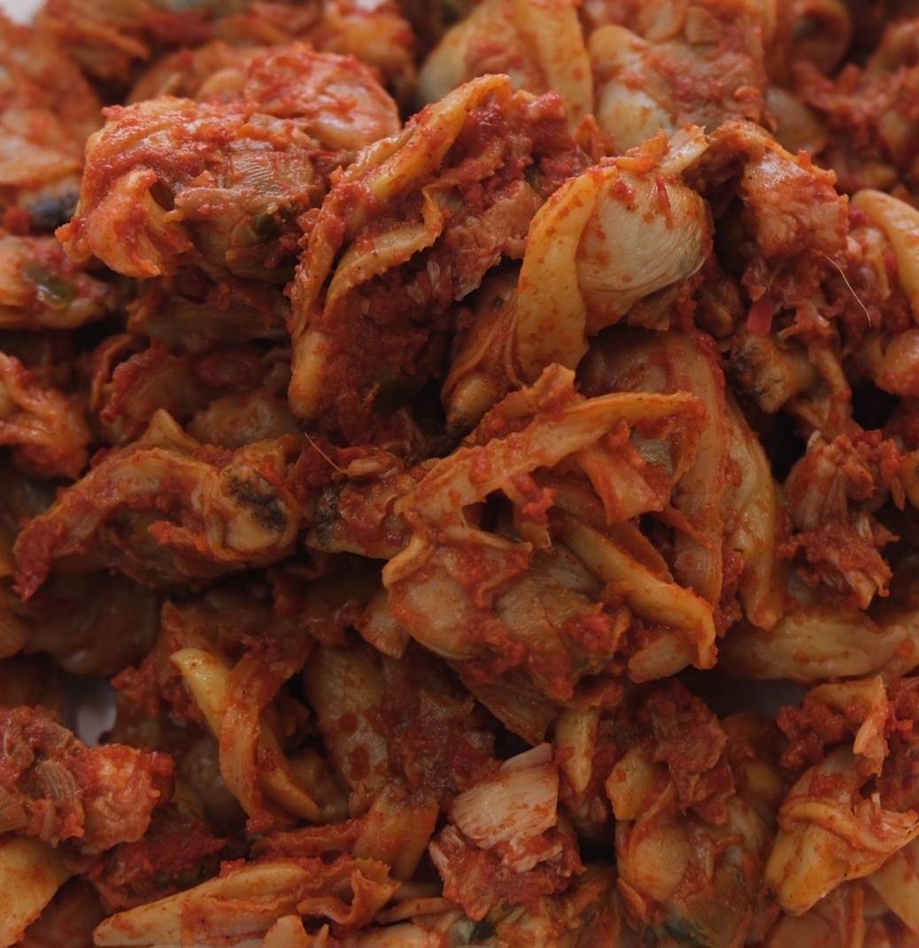 ボイルされたアサリを使用しており、濃厚な旨味が詰まったキムチです。また、少し辛めに仕上げていますので、お酒の肴に少しずつ召し上るにも最適です。もちろんご飯のお供にも合いますので是非おかずとしてもご賞味下さい。