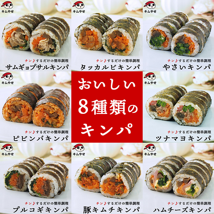 【商品名】キンパ8種(プルコギ・豚キムチ・ツナマヨ・ハムチーズ・野菜・ピビンパ・タッカルビ・サムギョプサル)