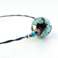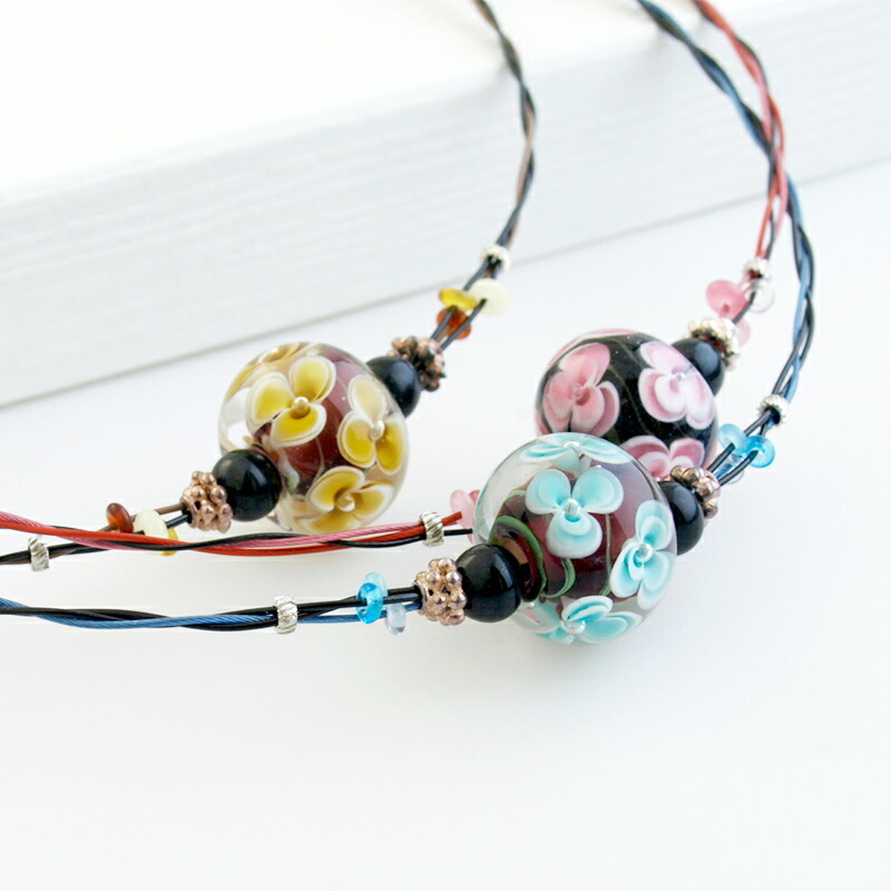 立体的なお花が6つとじ込められた水中花(ふたえ)とんぼ玉のネックレスです。