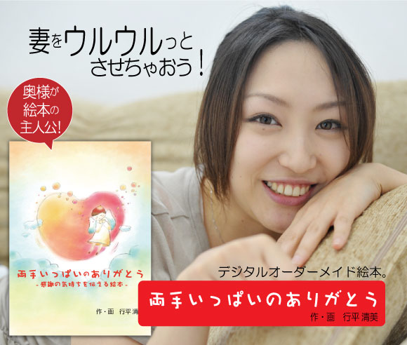 ○オリジナル絵本「両手いっぱいのありがとう」は、あなたの奥様が主人公で登場する、世界に1冊だけの名入れ絵本。