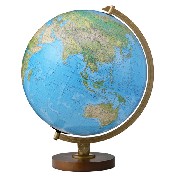 緯度目盛りが陽刻された金属製半円子午環と、丁寧にろくろ加工され、ウォルナット調に塗装された木製の架台が組み合わされています。 山岳隆起加工が施され、照明を点灯していない時は、陸地は森林、草原、砂漠、ツンドラ等の10種類の気候風土に沿った地勢地図です。 ライトを点灯すると陸地が国別に色分けされた行政地図に変化するので1台で二通りの機能を楽しむことができます。」