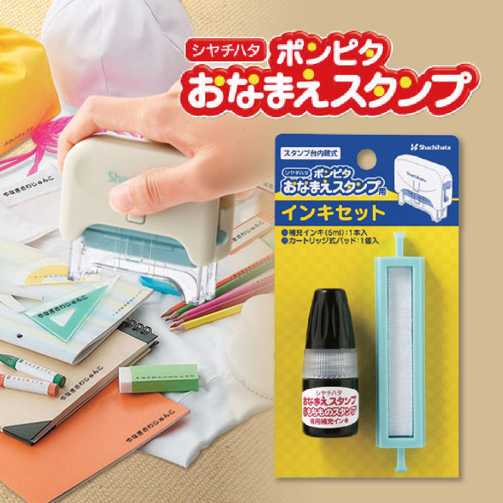 ポンピタおなまえスタンプのカートリッジ式パッド付きインキセットです。