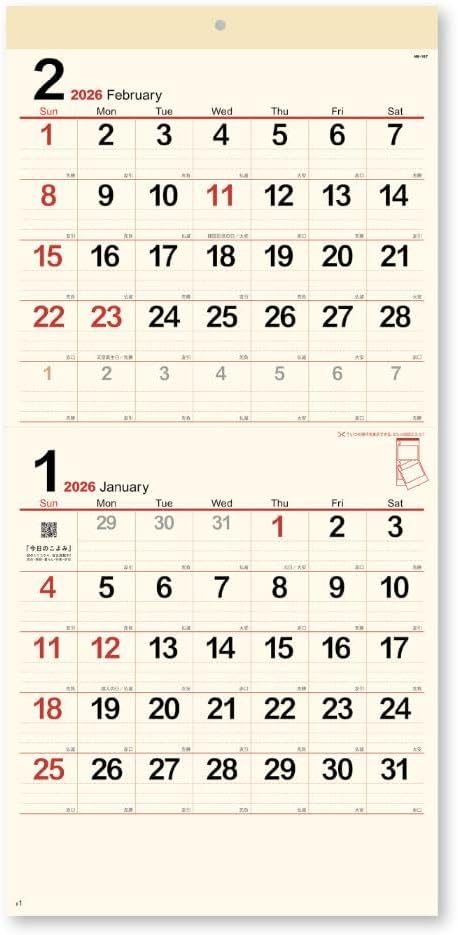 【土日祝も発送可】2026年 壁掛けカレンダー クリームメモ・2か月文字 年表付NK167 535×254mm