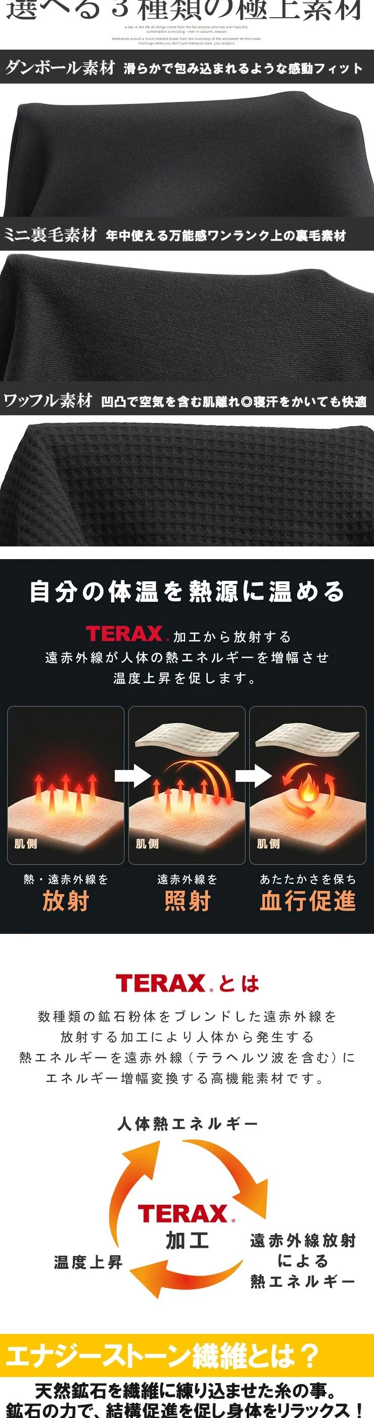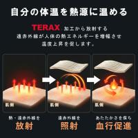 背当て部分と腰当て部分にTERAX生地を配置し、体温を熱源に遠赤外線を放射することで、あたたかさを保ちながらリラックスタイムをサポートします。