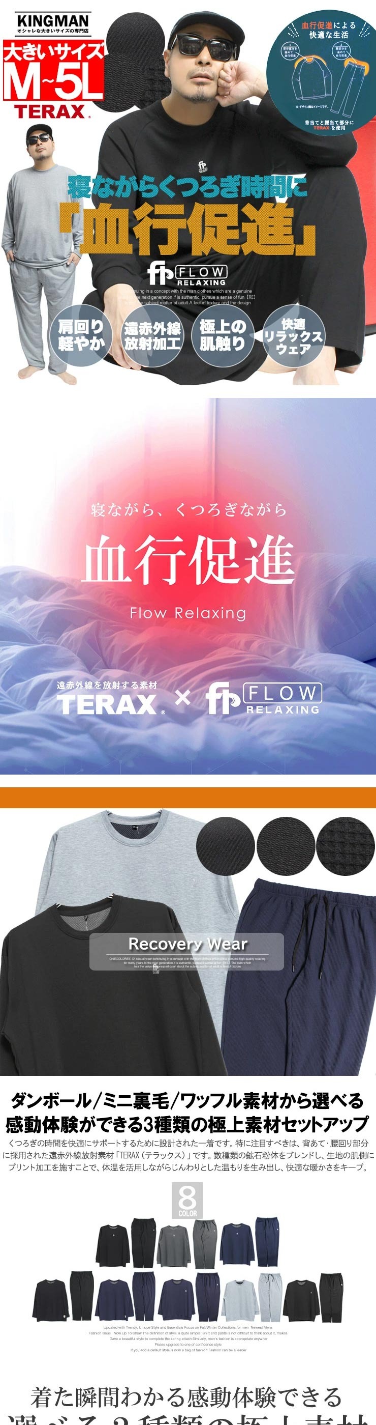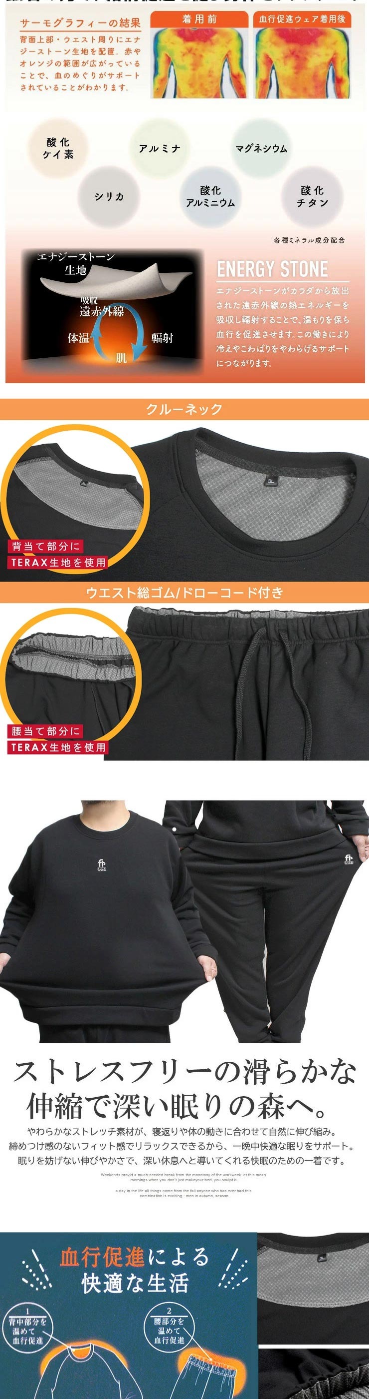 寝ながら、くつろぎながら毎日を快適に。遠赤外線素材TERAXを使用したリラクシングウェア上下セットです。