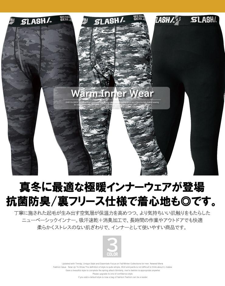 カラーは無地から迷彩柄まで幅広く展開し、作業着・スポーツ・普段の防寒インナーとして万能に活躍。