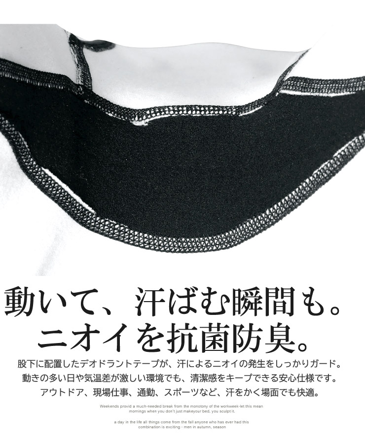 股下部分にデオドラントテープを配置し、ニオイの原因になる汗をしっかりガード。清潔感をキープします。