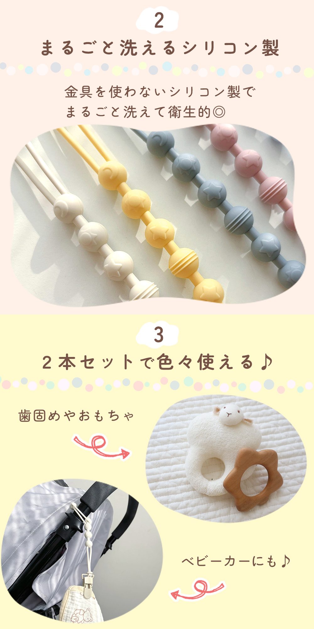 シリコン/トイストラップ/2本セット/おしゃぶり/クリップ/紛失防止/洗える/男の子/女の子/ベビーカー/赤ちゃん/子供/ベビー/おもちゃホルダー/おしゃぶりホルダー/トイバンド/インスタ映え/SNS/写真/玩具ホルダー/かわいい/おしゃれ/安全/落下防止/マルチホルダー/おもちゃバンド/ベビーストラップ/お出かけ/旅行/ギフト/プレゼント/出産祝い/おもちゃストラップ/