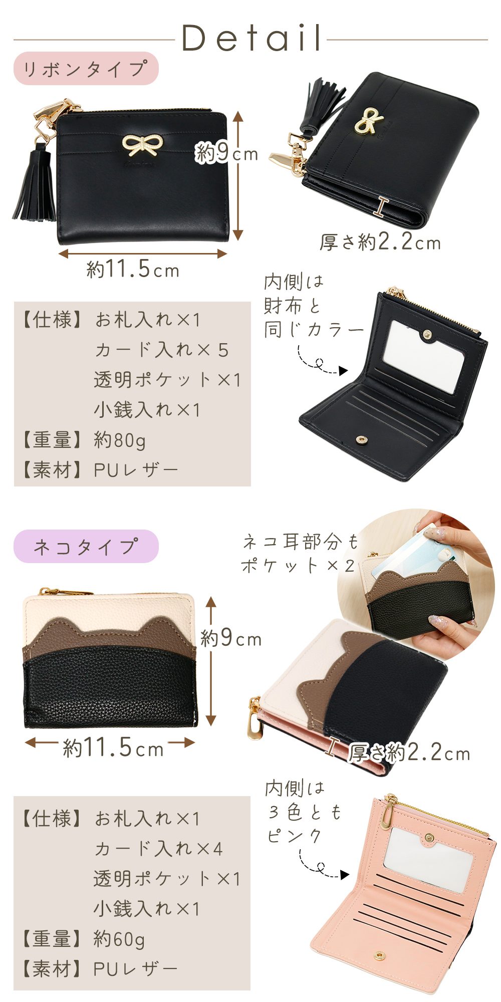 ・選べる2タイプのかわいいデザインリボンと猫モチーフの2タイプから選べる、おしゃれでキュートなデザインです。ネコ、ねこ、猫をイメージした猫耳のワンポイントや、上品なチャーム、揺れるタッセルがさりげないアクセントに。かわいい雰囲気がありながらも甘すぎず、大人カワイイ印象で持てるのもポイントです。シンプルさの中に女の子らしさを取り入れているので、通学コーデやお出かけスタイルにもなじみやすく、長く愛用しやすいデザインです。