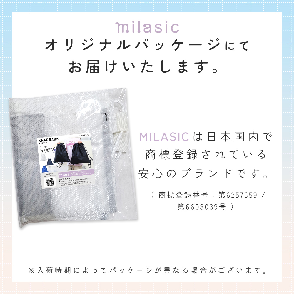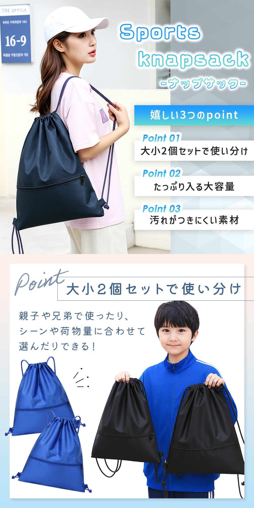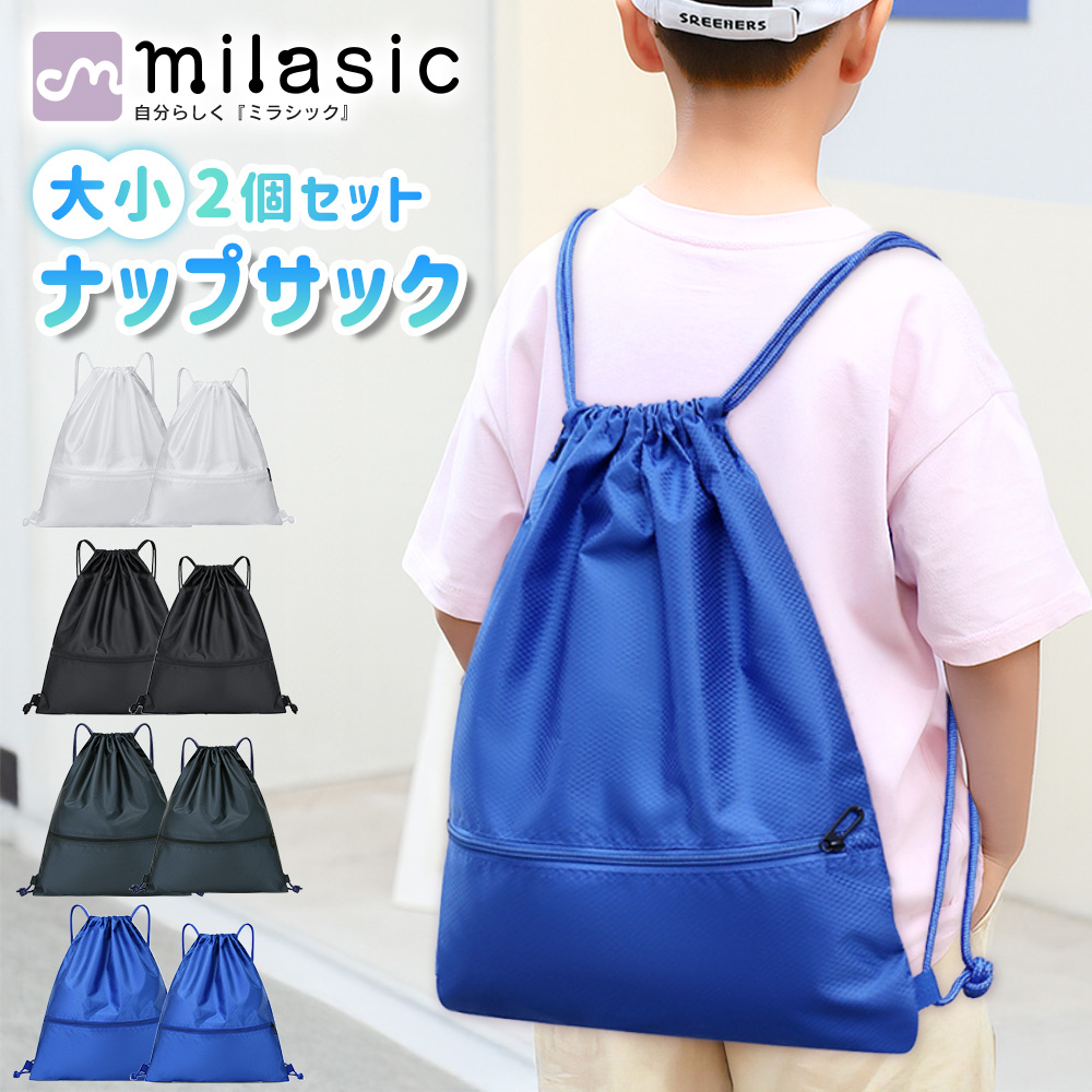 ・大小2個セットで使い分けできるナップサック通学や部活、習い事、ジム、アウトドアなど、毎日の荷物をしっかり収納できるスポーツナップサック。大きめサイズと小さめサイズの2個セットだから、荷物量やシーンに合わせて使い分けが可能。親子で共有したり、兄弟でそれぞれ使ったりと、使い道が広がる便利な巾着タイプのバッグです。