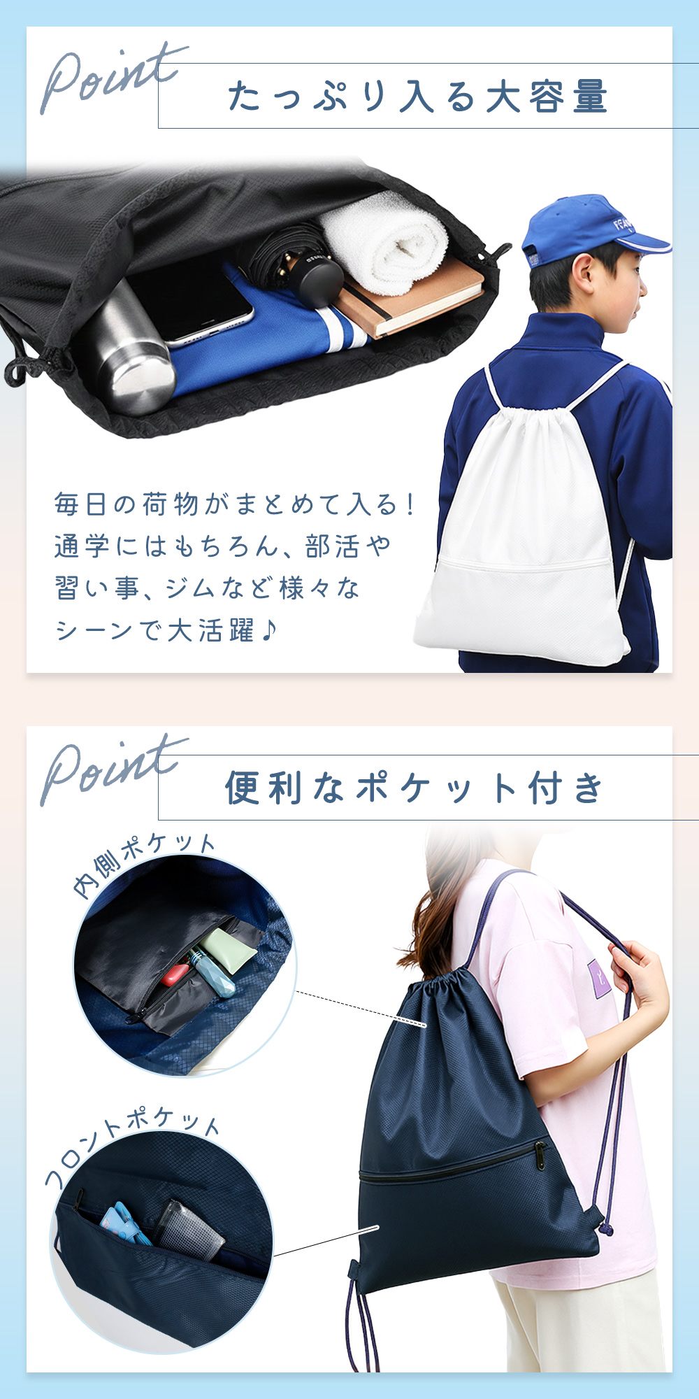 ・幅広いシーンで活躍通学、部活、ジム、習い事、プール、海、ビーチ、温泉、アウトドア、ハイキングなど、さまざまな場面で使える万能ザック。スポーツバッグや巾着リュックとして、毎日の相棒になるアイテムです。
