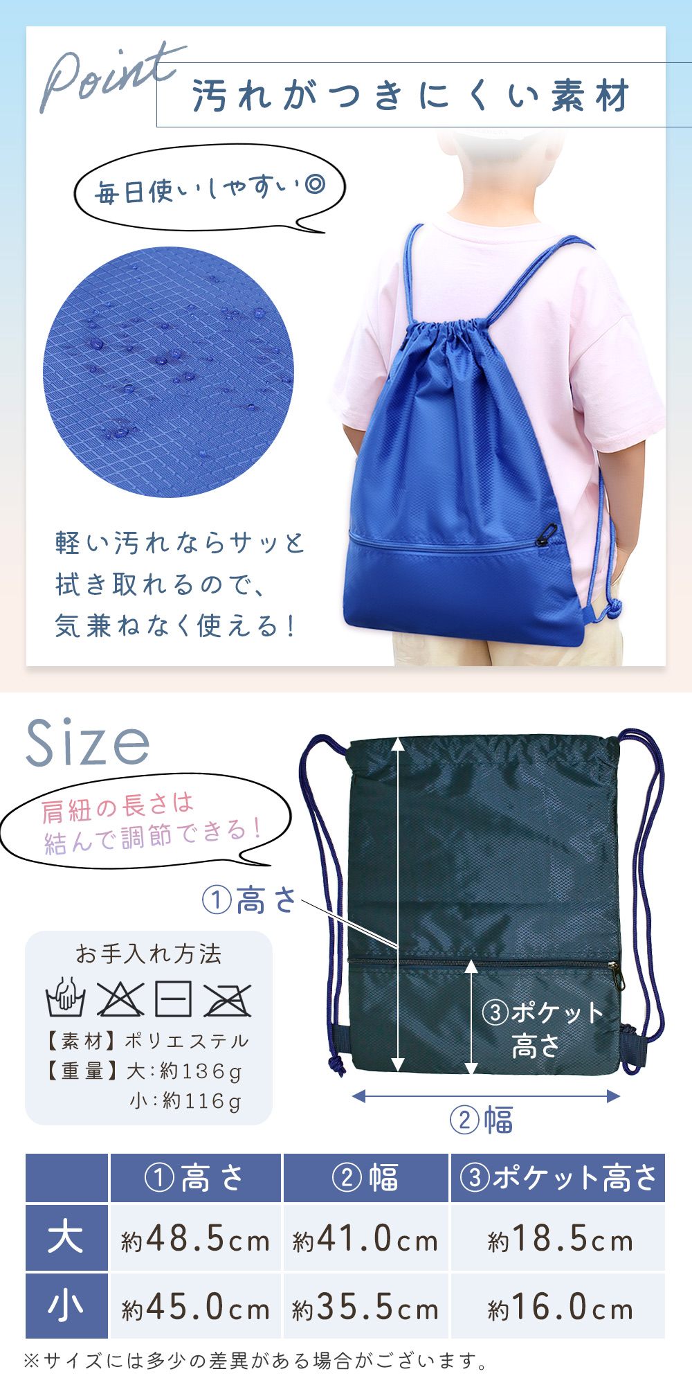 ・シンプルでおしゃれなデザイン男女問わず使いやすいシンプルデザイン。メンズもレディースもキッズも使えるため、家族でおそろいにするのもおすすめ。通学用ナップサック、小学生の体操服袋、スポーツバッグ、シューズバッグとして幅広く活躍します。