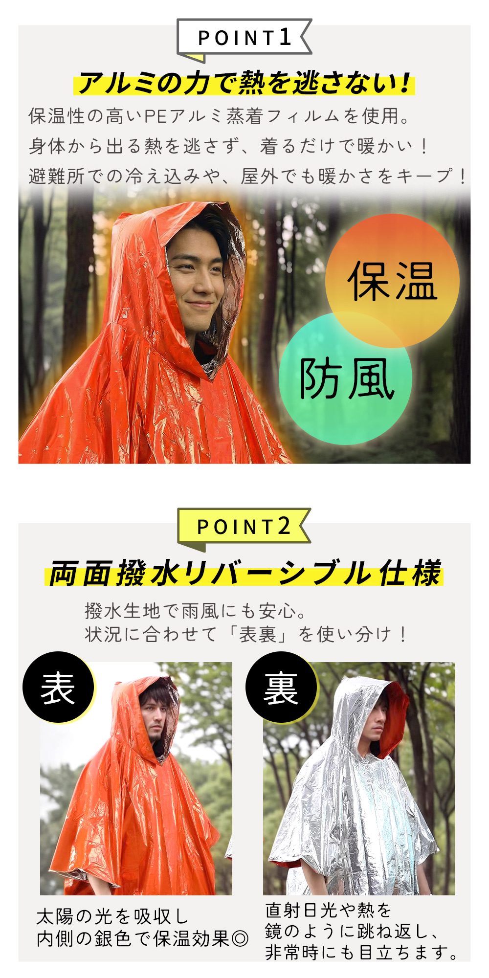 ・撥水リバーシブル仕様 雨具としても活躍撥水生地で雨風をガードし、状況に合わせて表裏を使い分け可能。アウトドア、野外、登山、ハイキングなどのエマージェンシー用品としても便利です。