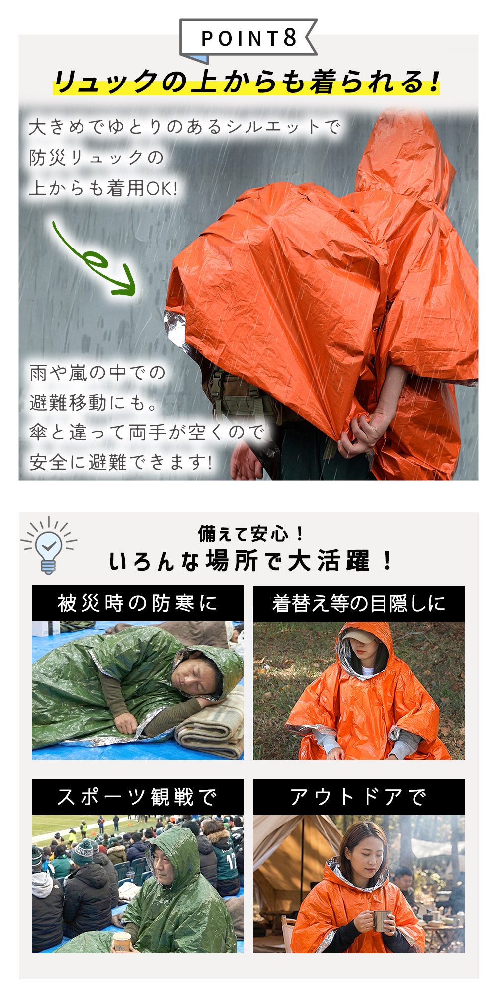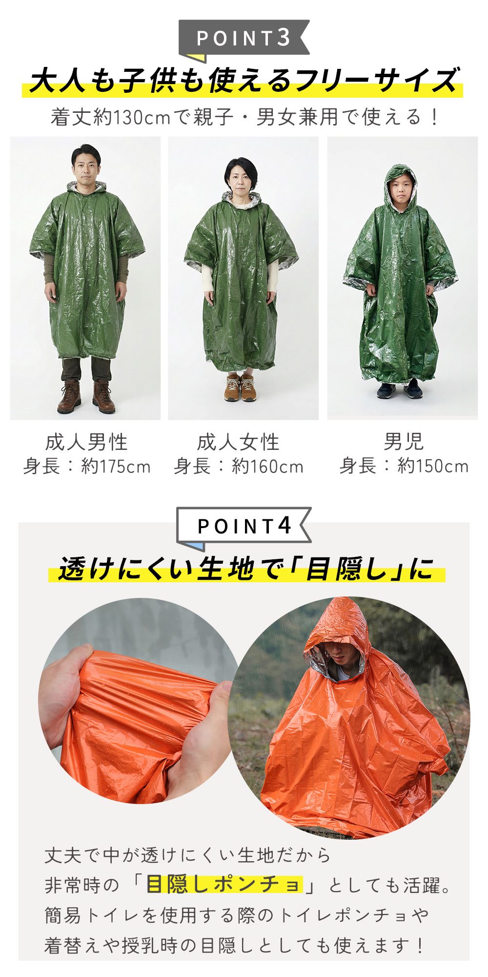 ・透けにくい生地で目隠しに トイレ・着替え・授乳にも丈夫で透けにくいので、簡易トイレや着替え時の視線対策に。非常時のプライバシーを守る目隠しポンチョとしても活躍します。