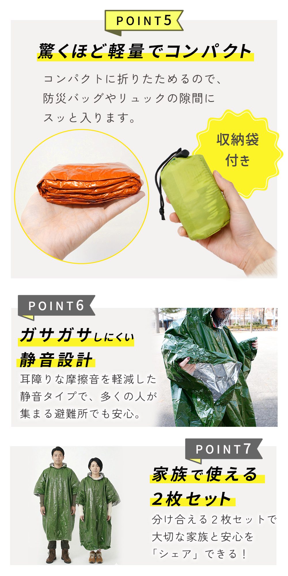 ・軽量コンパクト 収納袋付き&静音でガサガサしないコンパクトに折りたためて、防災バッグやリュックに入れやすい軽量設計。収納袋付きで持ち運び簡単、静音タイプで避難所でも使いやすい仕様です。