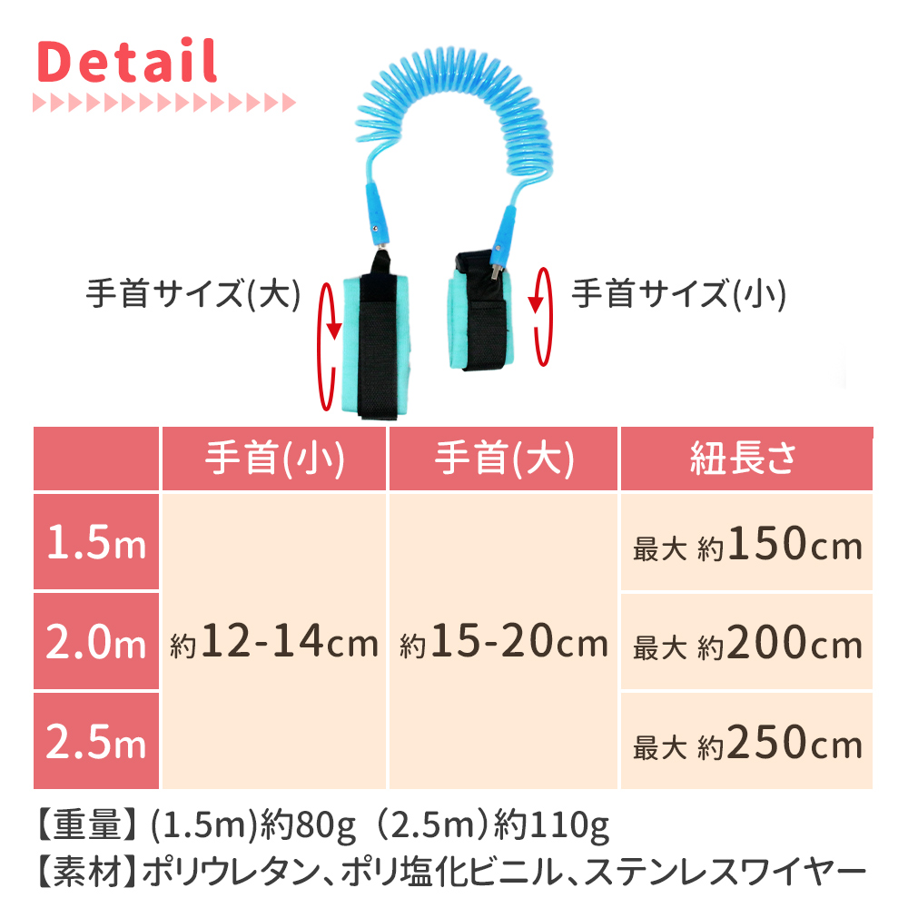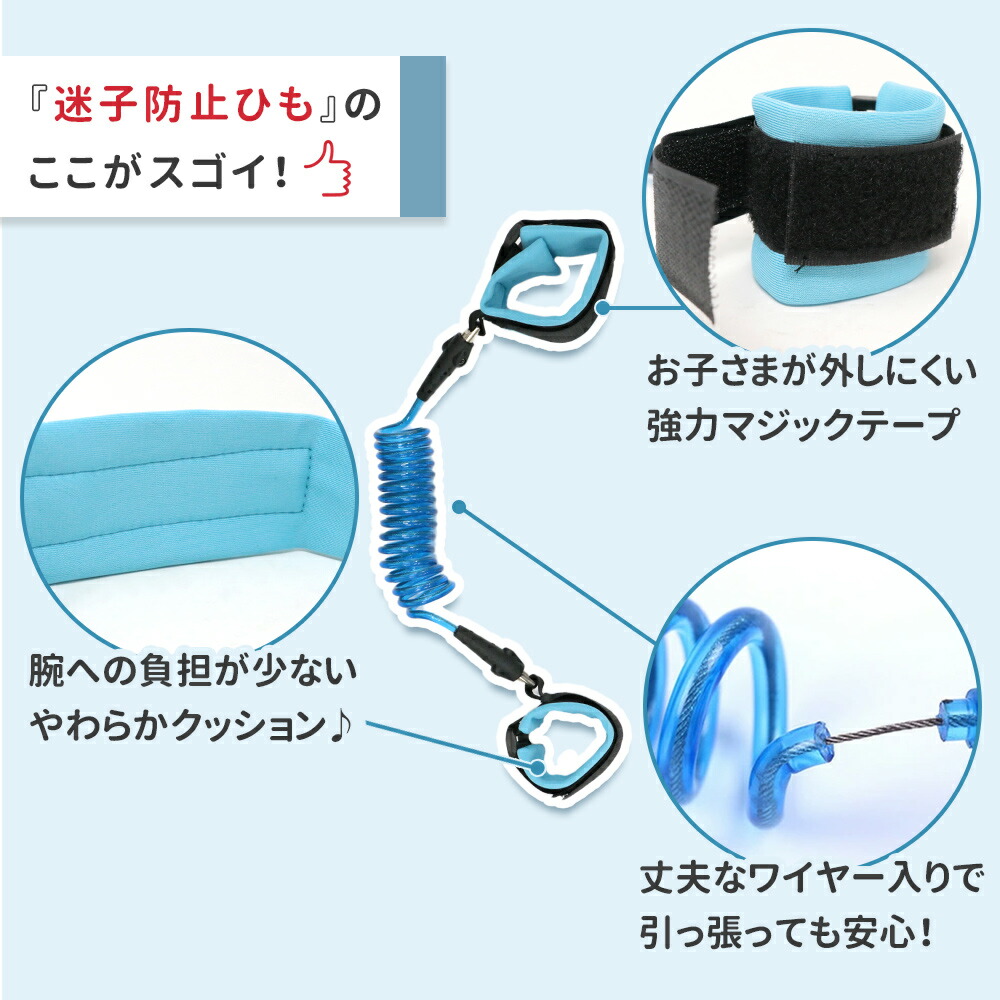 迷子/迷子防止/防止/迷子防止紐/リストバンド/迷子紐/お散歩/ハンドベル/ロープ/ハーネス/セーフティ/安全/リュック/迷子対策/お散歩/飛び出し/飛び出し防止/お散歩/手つなぎ/旅行/お出かけ/ベビー/子供/こども/迷子防止グッズ/危険防止/セーフティハーネス/1.5m/2.5m/ブルー/ピンク/オレンジ/手首ハーネス/幼児/テーマパーク/人混み/360度回転/防犯/安全対策/伸びる/セーフティーグッズ/