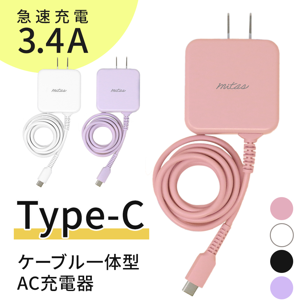 Type-C/type-c/タイプC/コンセント/一体型/折りたたみ/プラグ/ケーブル/150cm/150/1.5m/1.5/充電器/AC/アダプタ/ACアダプタ/急速充電/3.4/3.4A/旅行/出張/お泊り/お出かけ/コンパクト/絶縁/絶縁カバー/火災/火災防止/ゲーム機/タブレット/持ち運び/PSE/海外/海外対応/マカロン/韓国風/パステルカラー/Cタイプ/スイッチ対応/おしゃれ/小型/かわいい/カラフル/ダスティピンク/ホワイト/ブラック/携帯充電器/軽量/軽量/チャージャー/折りたたみ式プラグ/モバイル/