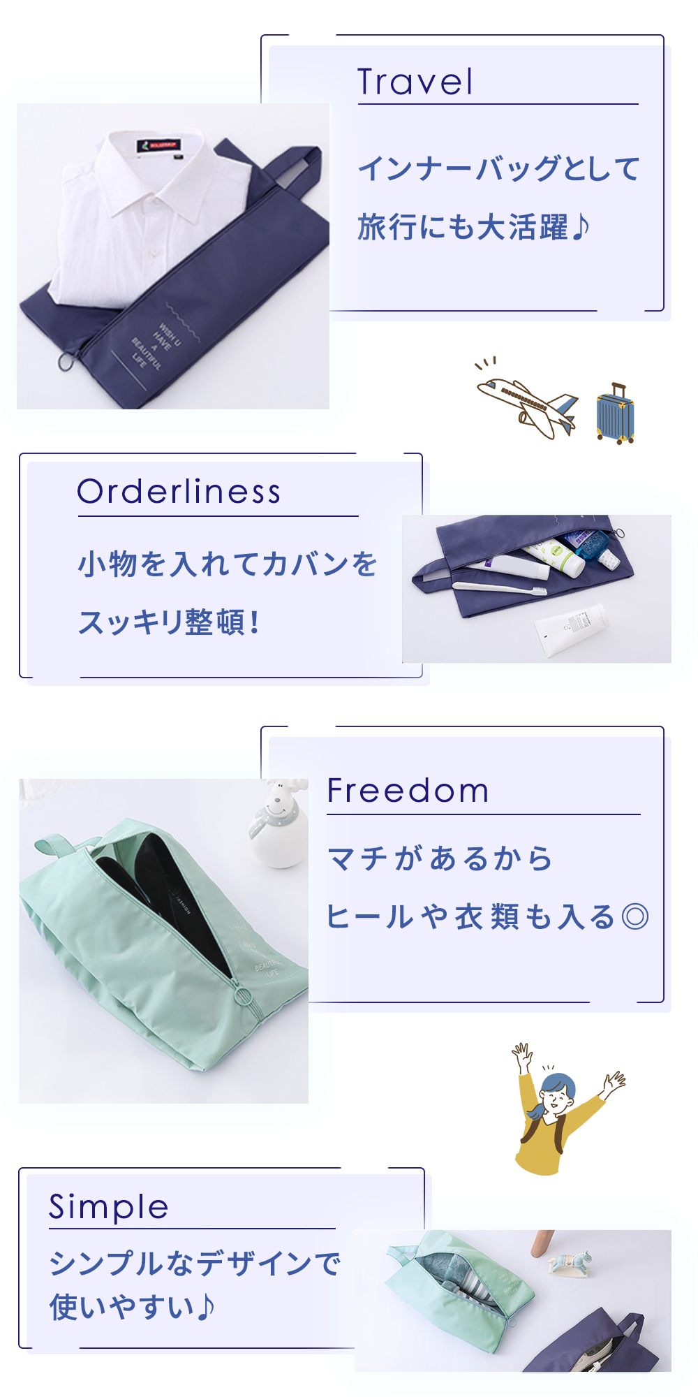 旅行や出張時のトラベルポーチやバッグインバッグとしても使用できるため、靴だけに限らずマルチに使えるのがポイントです。