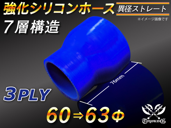 | 商品名 | TOYOKING 強化 シリコンホース ストレート ショート 異径 内径 Φ60-63mm 長さ76mm 青色 ロゴマーク無し 汎用品 | | 内径 | Φ60-63mm | | 長さ | 76mm | | 肉厚 | 約4.5mm | | 許容差 | ±0.5mm | | 構造 | 3プライ 7層構造 | | 取付範囲 | 内径±1〜2mm程度 | | 耐熱温度 | 約−50℃〜+200℃ | | メーカー | TOYOKING | | 説明 | 自動車のインタークーラー、ターボ、インテーク、ラジェーターライン等の接続ホースです。 自動車はもちろん二輪バイク、重機、建設機械、各種機械等、幅広い用途にご使用頂けます。 高品質強化シリコン樹脂4層と高強度補強ファイバー繊維網3層の合計7層構造に作られた為、 耐熱・耐寒・耐圧・耐久性に優れています。 高圧力や高負荷時でも膨張や変形がほとんどなく、長時間優れた性能を発揮します。 豊富なサイズ・形状を取り扱いしておりますので、ご希望のサイズがきっと見つかるかも?