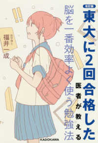東大に2度合格した私が実践した、脳を効率良く使える勉強法です。医学論文や医学研究の結果を、「勉強が楽しいと思うと、βエンドルフィンが出て、海馬の記憶力がアップする」といったように、実用的で役立つものに応用。「何から手をつけたらいいかわからない→左脳の前頭葉に相談して解決」、「受験勉強は左脳をメインに使う」、「英語の基礎固めは言語野を利用する」、「現代文の評論文は前頭葉を使わない」、「日本史と世界史のイメージ暗記法」、「『暗記科目』数学の勉強法」、「化学は写真のイメージで覚える」など、医学的な見地からみて正しい「脳科学的勉強法」を紹介。改訂にあたり、激変する入試英語にも対応。「話す」「聞く」「書く」「読む」の4技能を鍛える勉強法を書き下ろしました。