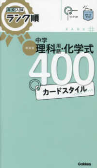 入試問題データをランク順に並べた,用語集の決定版がポケットサイズのカードに!入試によく出る400語が厳選されているから,すきま時間に効率よく確認できる!自由自在に並べ替えたり,覚えたい用語だけを持ち歩いたりと使い道がたくさん。リングつき。