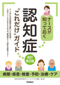 ナースのための認知症本の決定版.病態・疾患・検査・予防・治療・ケアに関する,必須,かつ最前線の知識が身につく1冊.各テーマの冒頭にビジュアルポイント付き.豊富な図表も相まって,カラフル誌面で認知症の最新情報がやさしくわかる.臨床像,画像診断,神経心理学的診断,認知症の危険因子、社会資源の活用まで幅広く網羅し,昨今の状況に合わせた最新情報を豊富に盛り込んだ,看護師,介護士ら認知症に関わるすべての専門職の方のためのトータルガイド.